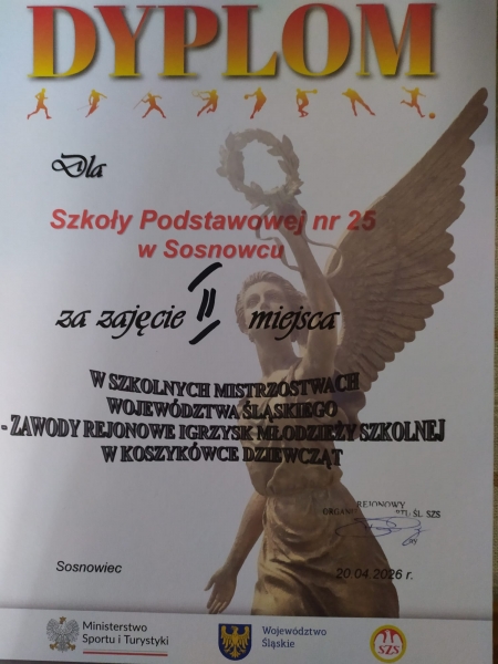 20 kwietnia 2026 roku odbyły się Szkolne Mistrzostwa Województwa Śląskiego - Zawody Rejonowe Igrzysk Młodzieży Szkolnej w koszykówce dziewcząt, w których udział wzięły po dwie najlepsze szkoły z Jaworzna oraz Sosnowca. Rywalizacja była bardzo zacięta, a drużyny prezentowały wysoki poziom sportowy. Do finału awansowały szkoły SP 25 oraz SP 40 z Sosnowca. Po emocjonującym meczu ostatecznie zajęliśmy 2 miejsce, zdobywając tytuł wicemistrzyń rejonu.